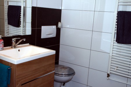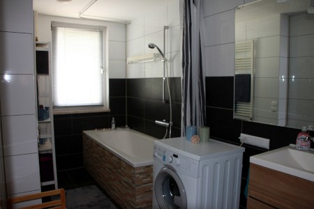 Bad mit Wanne, Dusche, Waschmaschine, WC und Fenster,